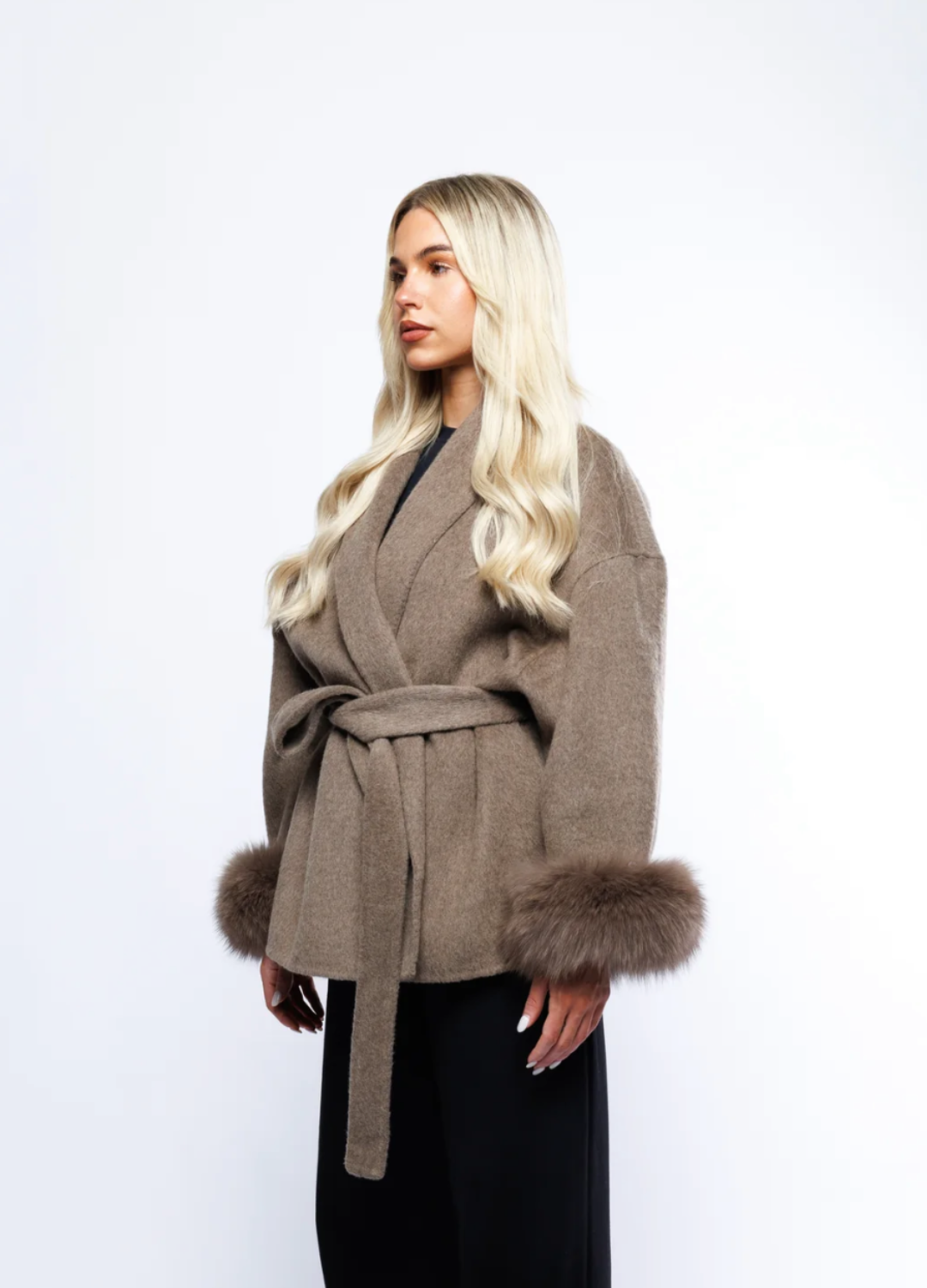 Elegancki i ciepły płaszcz z miękkiego kaszmiru zapewnia komfort i ponadczasowy wygląd w chłodniejszych miesiącach. Ma luźny fason i wiązanie w talii, co pozwala na indywidualne dopasowanie do sylwetki. Wyjątkowym akcentem są mankiety z naturalnego futra, które dodają całości elegancji i charakteru. Idealnie pasuje zarówno do sportowego, jak i bardziej klasycznego obuwia.